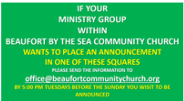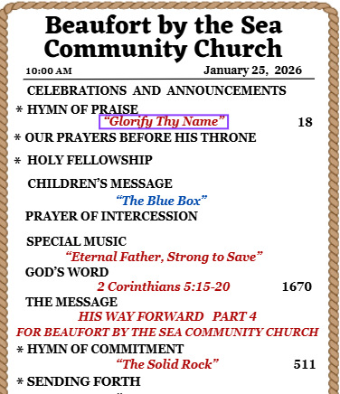 Join us for worship at 10:00am in person or online at https://www.facebook.com/beaufortbytheseacommunitychurch.