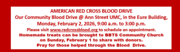 American Cross Blood Drive for our community at Ann Street UMC in the Eure Building. Homemade treats can be brought to BBTS on Sunday February 1st